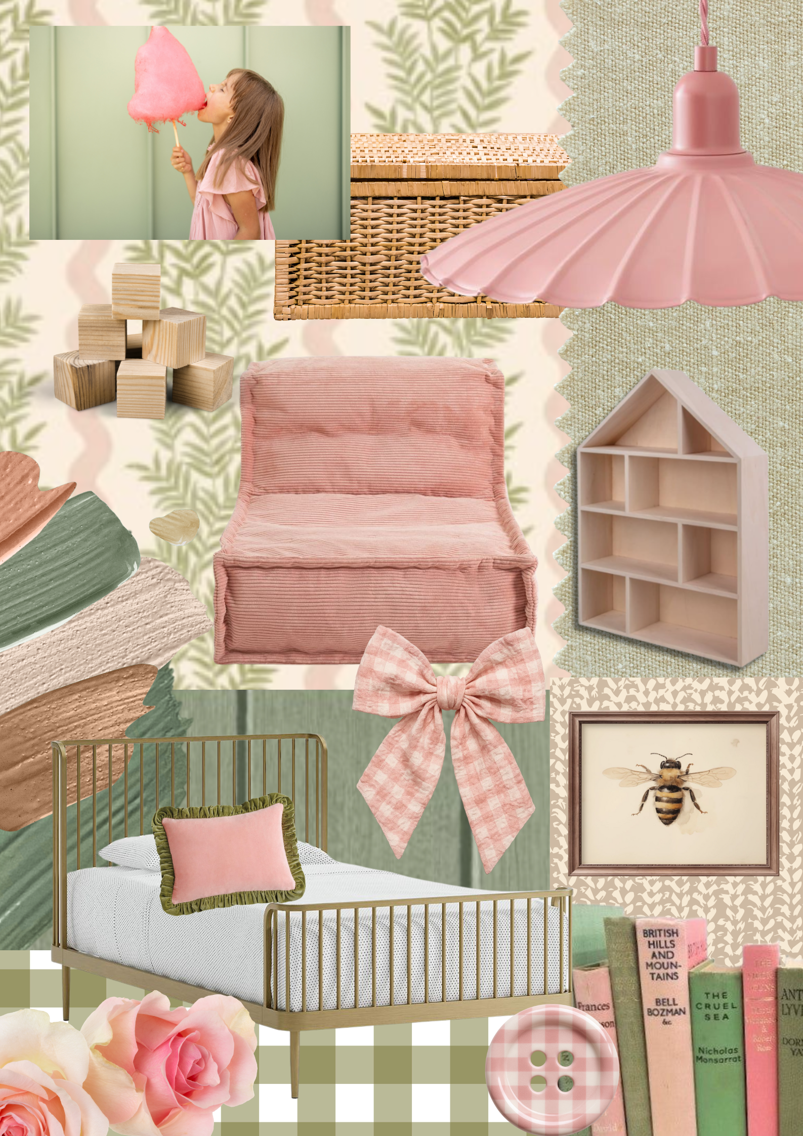 Brief- Vintage inspired colour palette using pinks and greens. Only requiring 3D visuals of one side of the room as they are keeping the existing wardrobes across the whole back wall. Lots of spaces to store toys and ‘treasures’ as well as a reading nook and a gallery wall. It should be cosy and match the feel of the rest of the cottage.