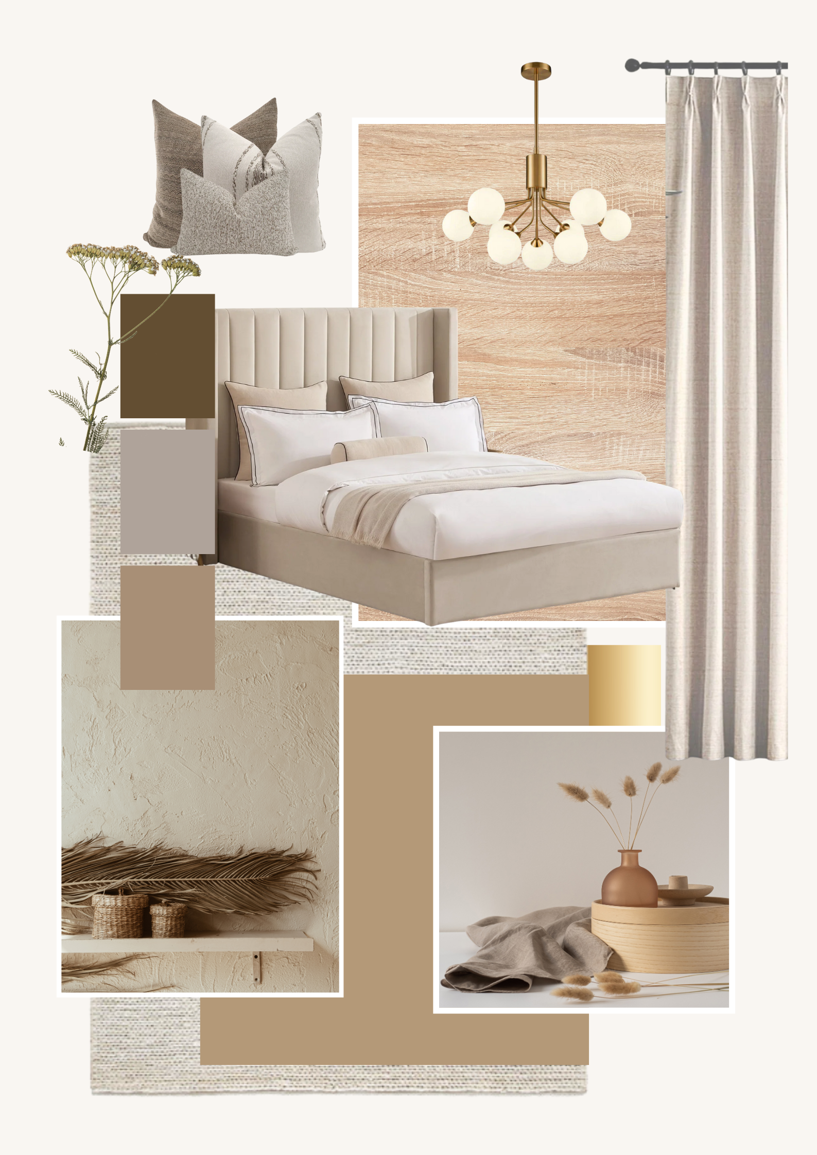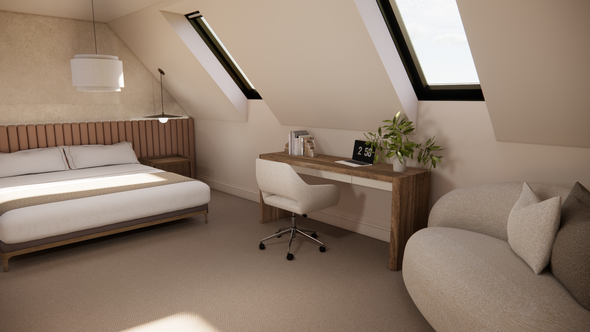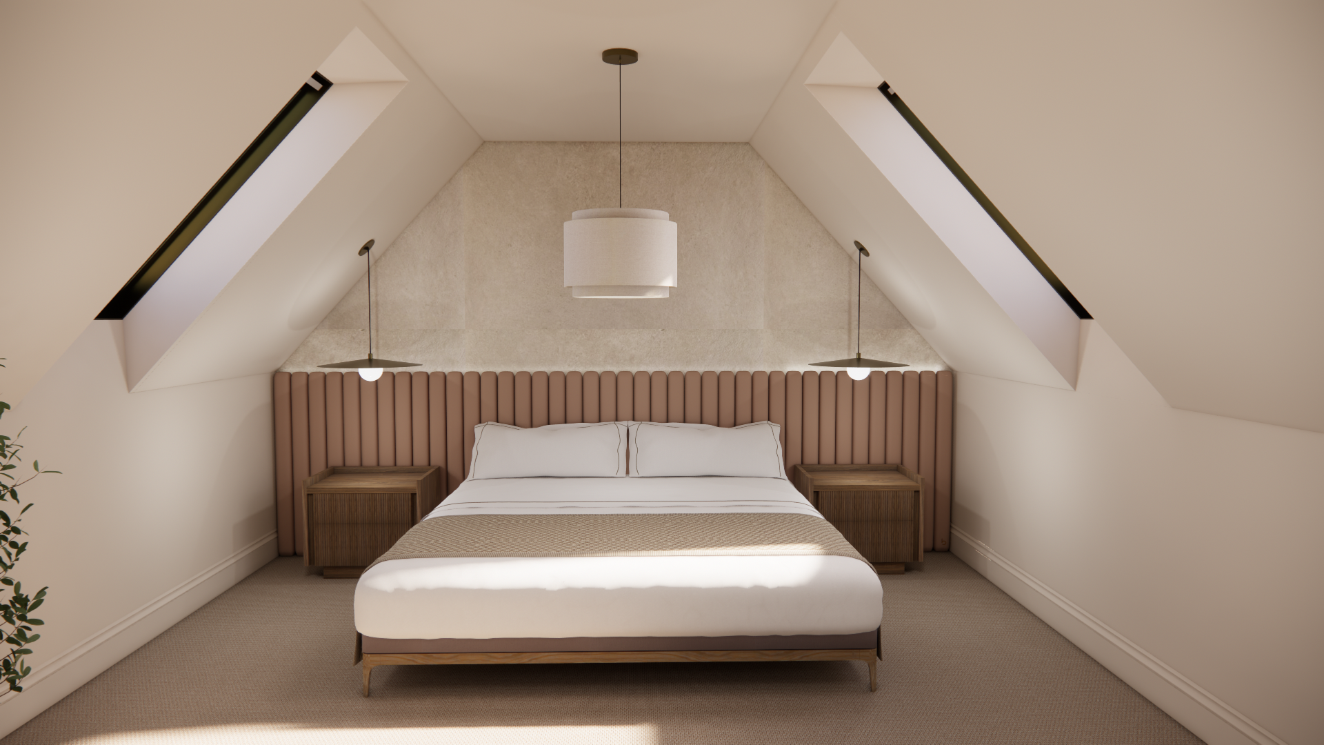 Brief- B&B suite to the agreed mood board style (neutral, wood, textures, plants, symmetry). Space for bedroom and lounge.