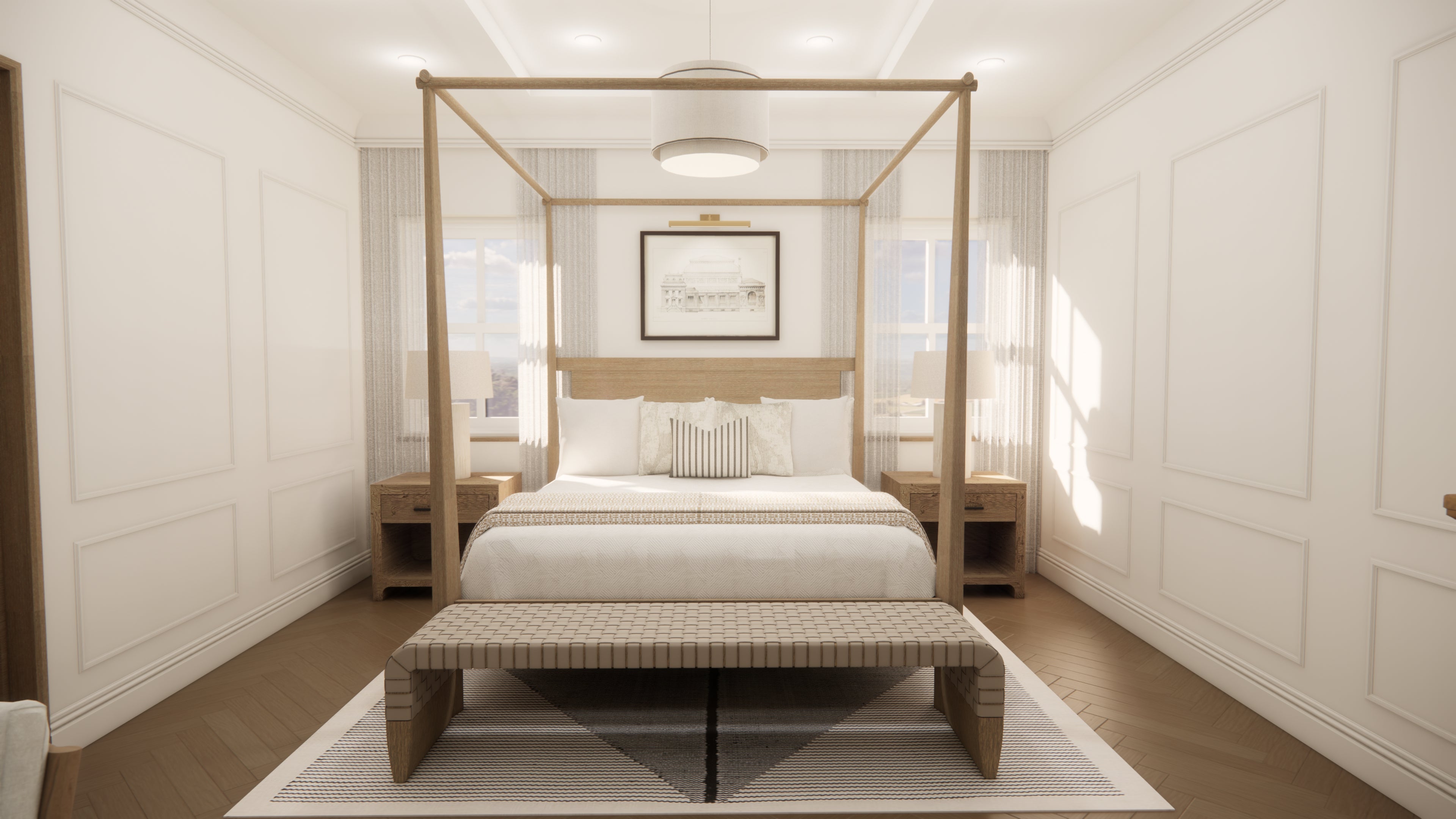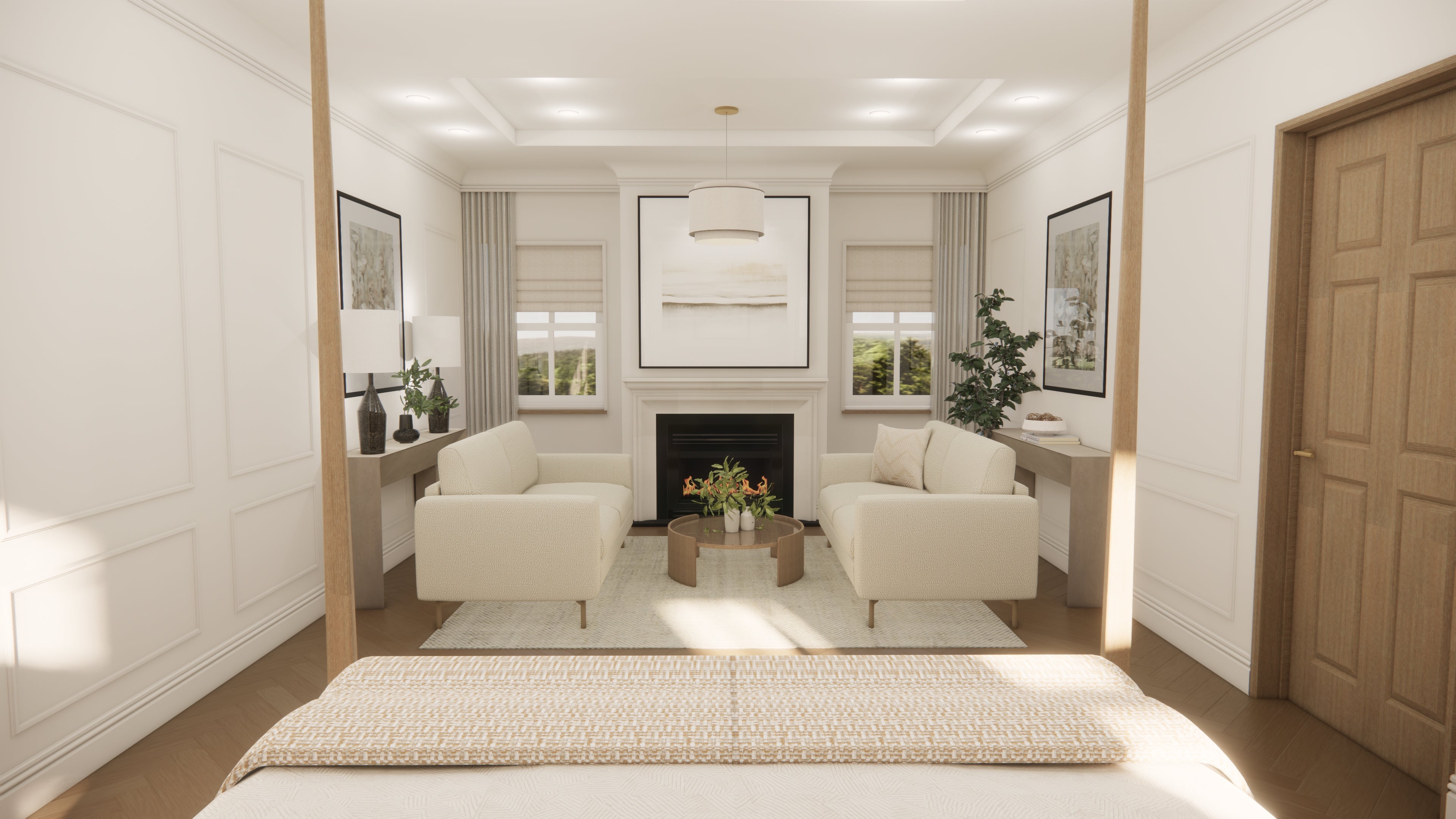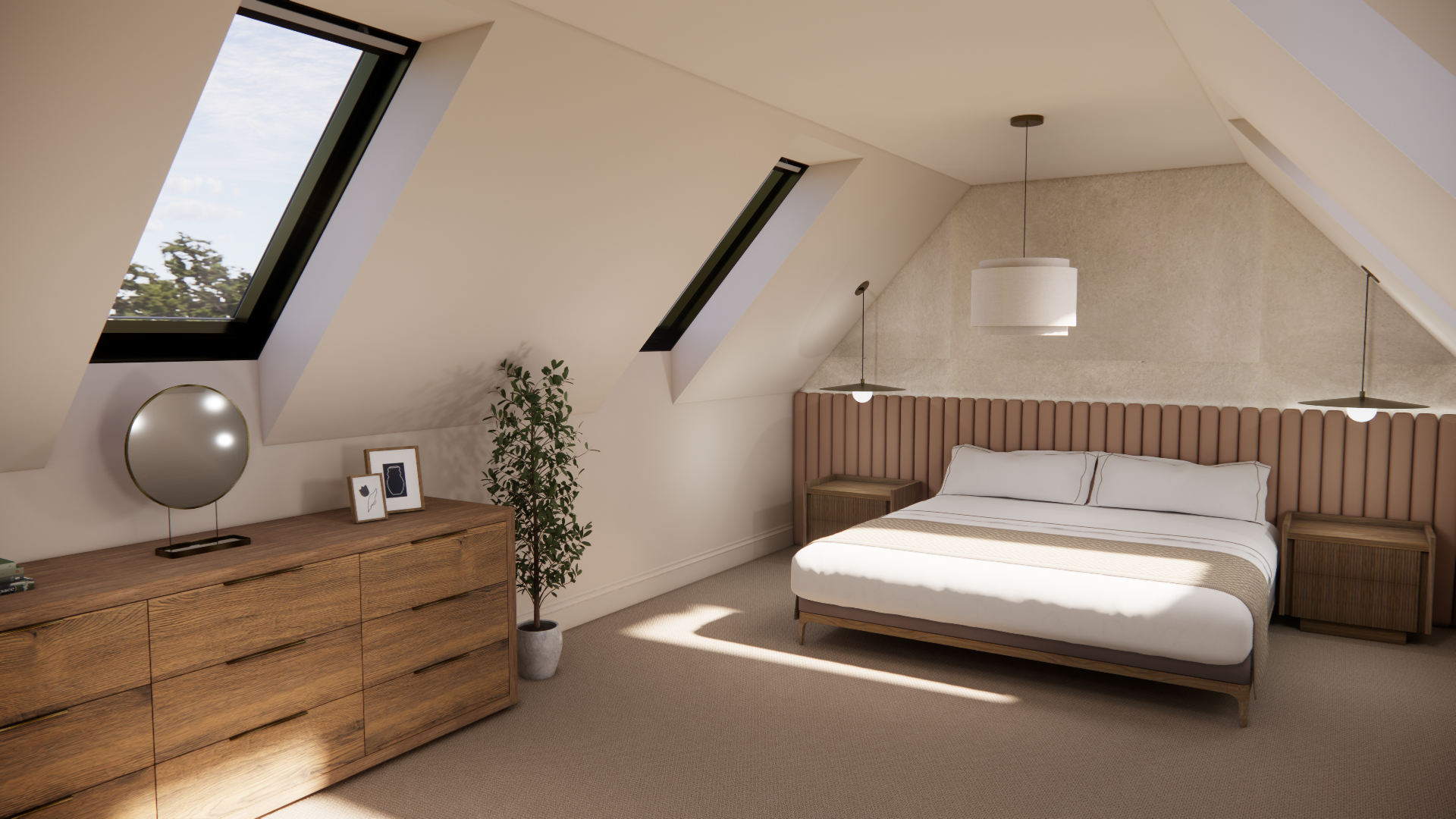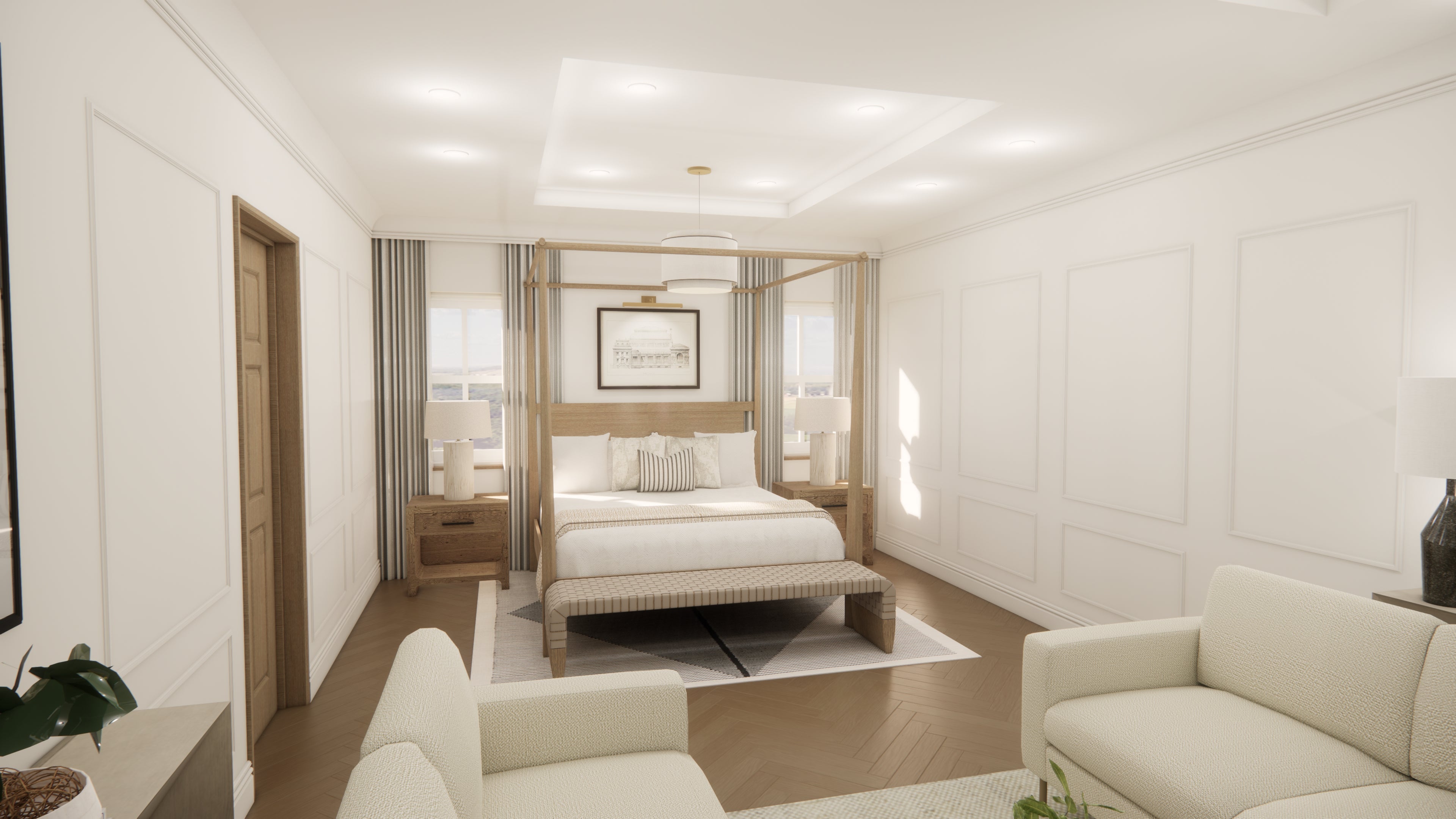 Brief- B&B suite to the agreed mood board style (neutral, wood, textures, plants, symmetry). Space for bedroom and lounge.