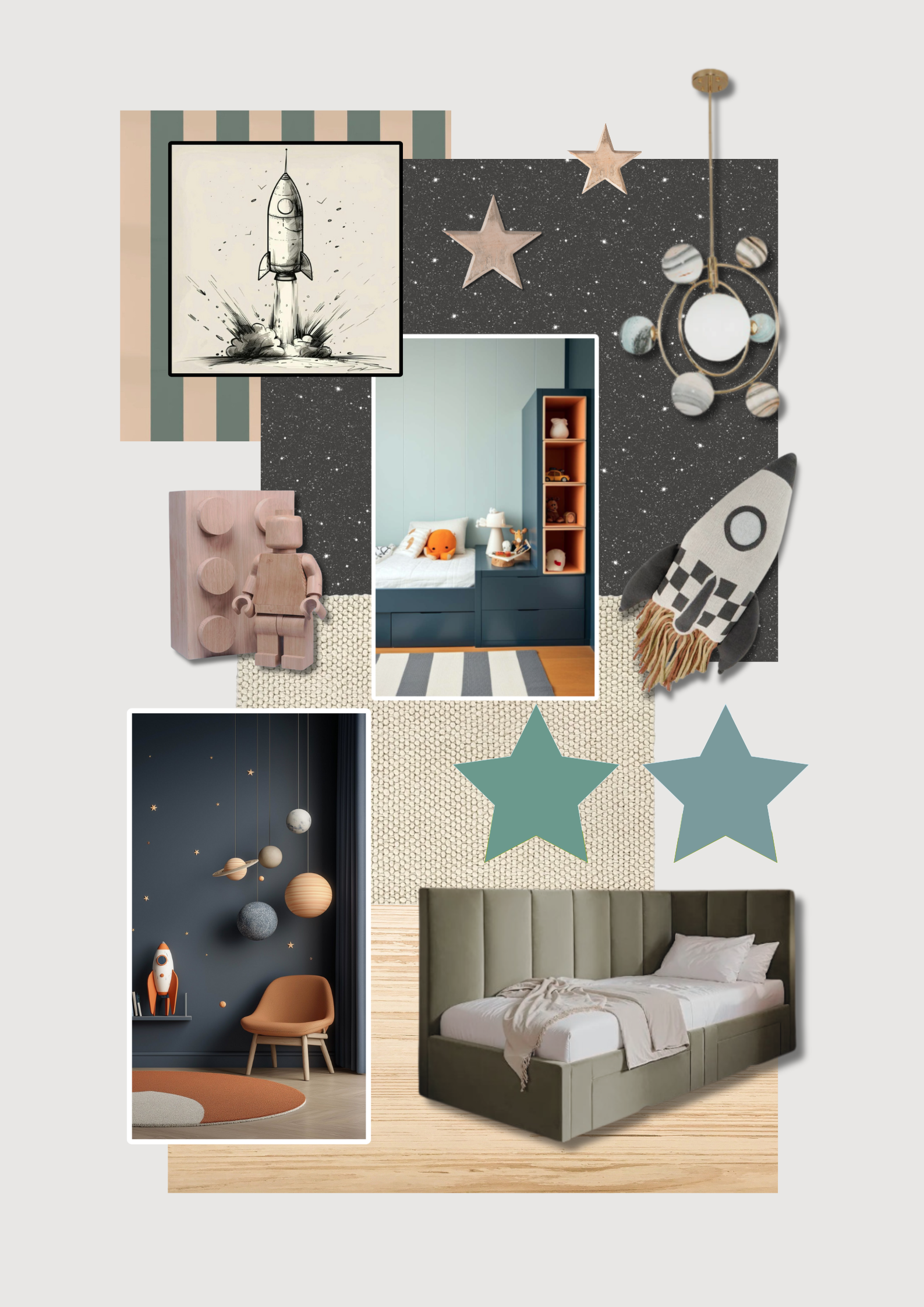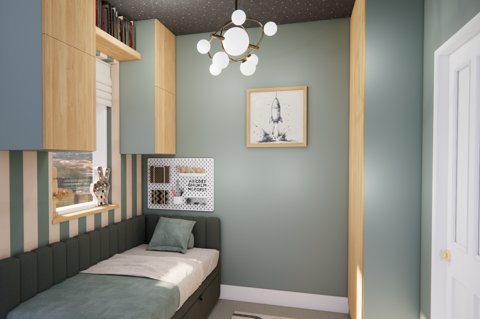 Brief- Maximise space in a small box bedroom. The room is for a young boy and the client has decided to take their son out of their cot and into their first big bed. They needed help fitting a bed, wardrobe and storage in to the space as well as configuring the space to hopefully give their son some floor space to play. The boy wanted a blue, space theme for the room but the client was concerned the dark colours would make the room feel too small so thought seeing the room finished as a 3D illustration would be helpful.