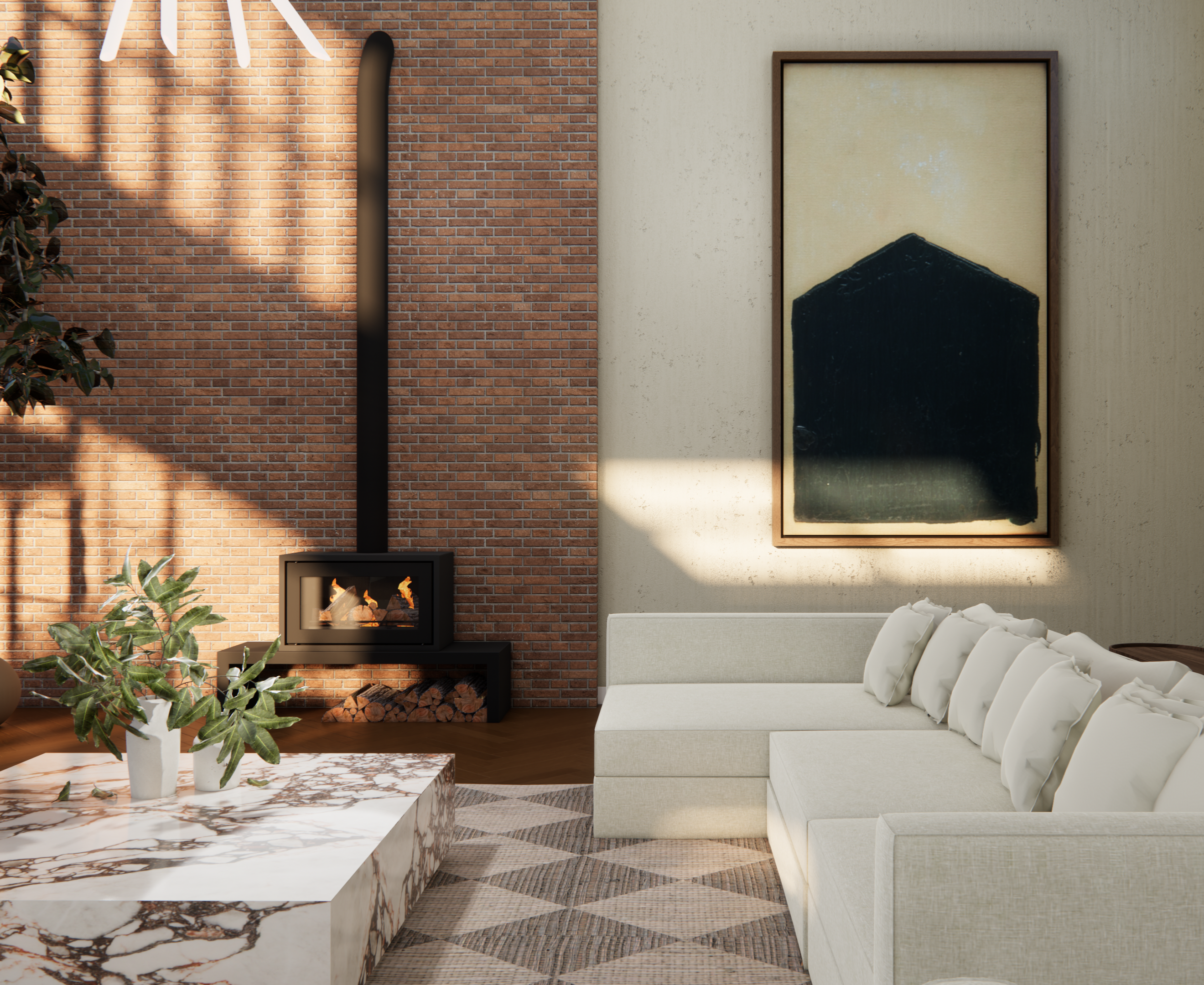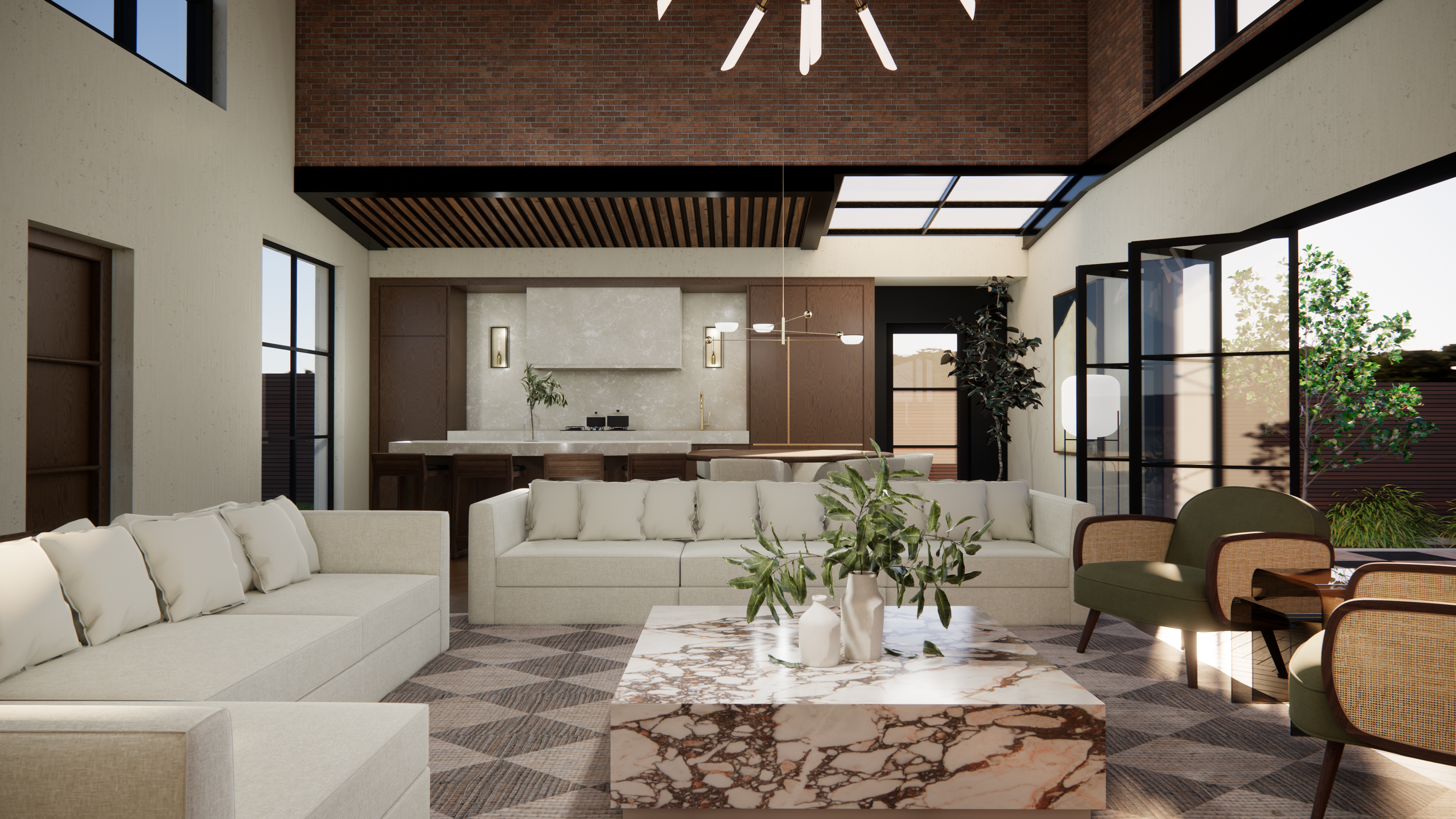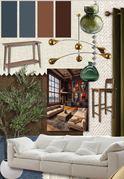 Brief- Help needed filling the large loft-style space in a converted mill, while still feeling warm, inviting and cosy. Neutral backdrop with warm accents of earthy greens and browns. Darker wood is preferred over light oaks. Statement lights, natural materials and greenery should be included. There should be space for dining, entertaining and a large lounge.