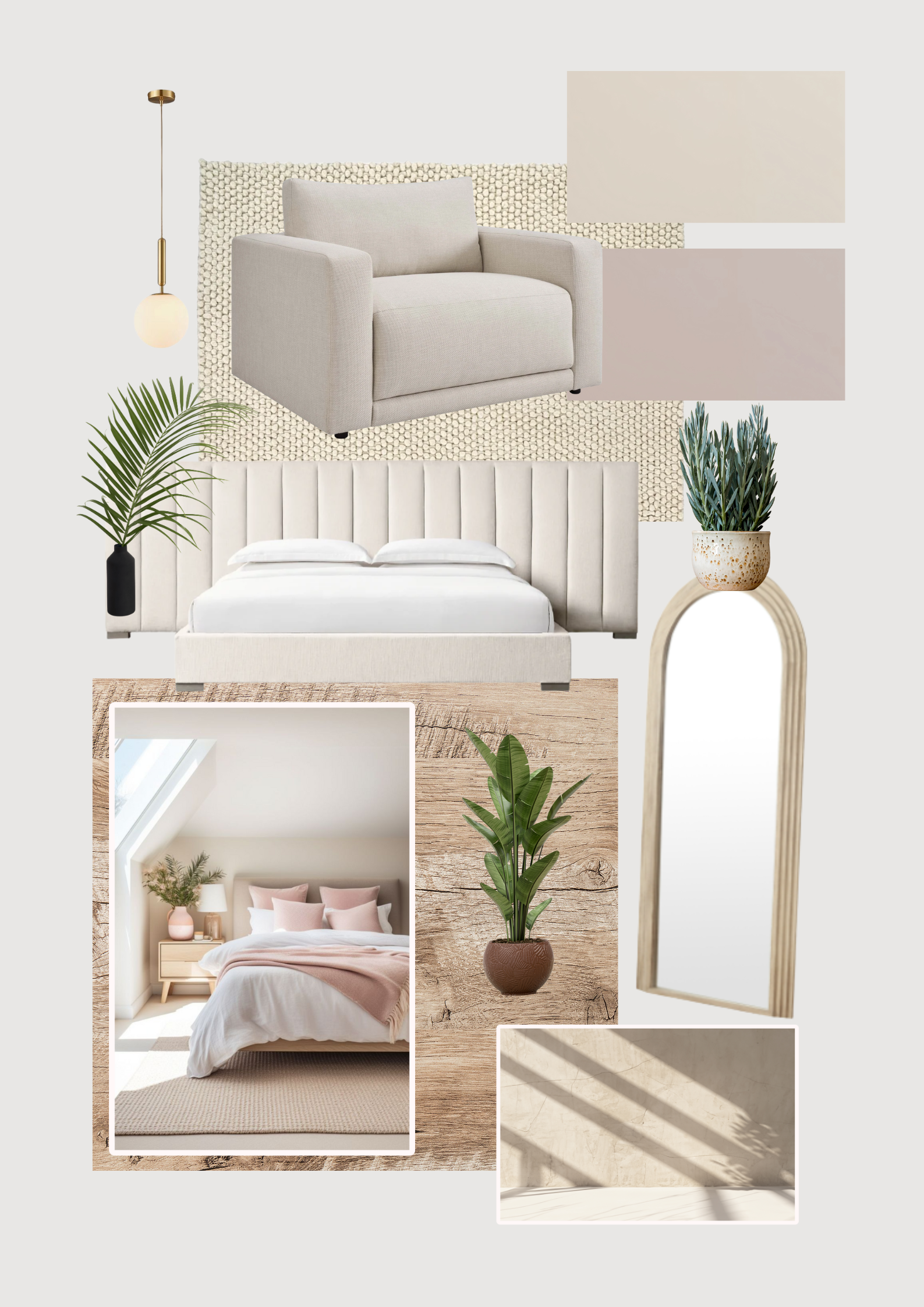 Brief- Bedroom for university student at their family home when she visits. Neutral with subtle pinks. Wants to incorporate natural woods and low maintenance plants. Requires a place to sit and relax as well as a place to study.