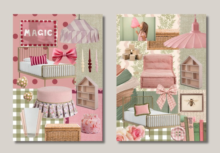 This client loved the modern-cottage theme in their initial mood board but decided they preferred the green over the pink as it was more fitting with their cottage style home. They made it clear which parts they loved and which parts they didn’t, they also explained why. This was very helpful as it gave the designer more information and they used this to inform their decisions when creating the second mood board.