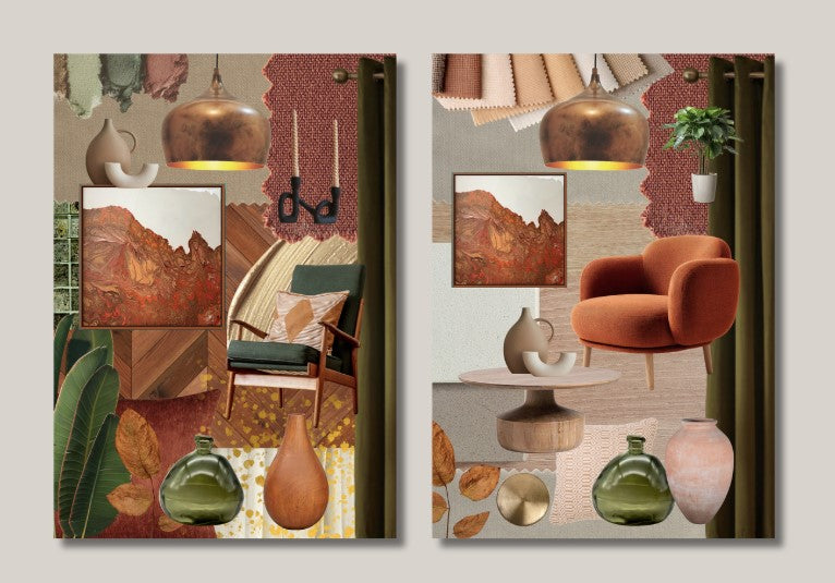 This client wanted a dark, autumnal theme running through their space. They liked most aspects of their first mood board but requested a lighter backdrop to make the darker pieces stand out within the room. Seeing the colours together on their initial mood board was very helpful for the client.It made them realise that they wanted to lean more into the oranges and have less green (which initially they thought they wanted as their main colour).